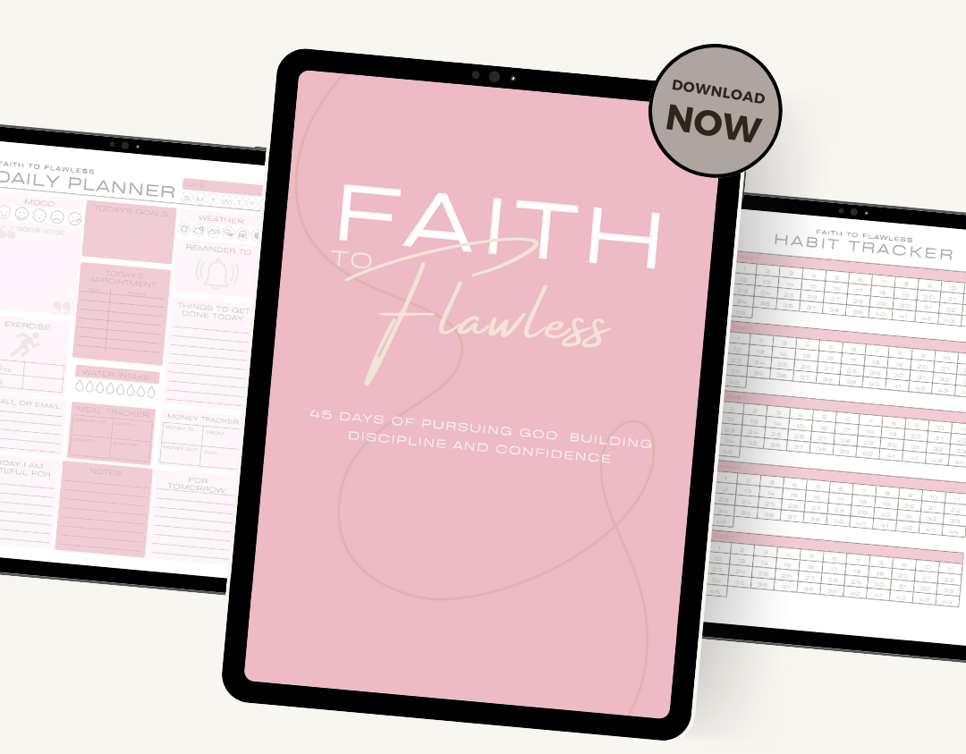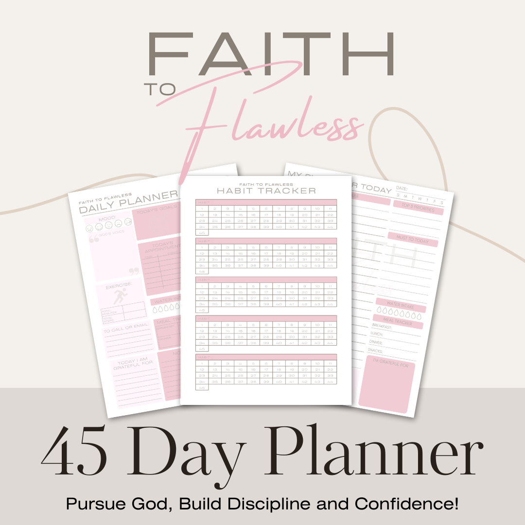 Introducing Faith to Flawless in 45 Days, a transformative digital planner designed to help you seek God, create discipline, and build unshakable confidence. This planner features: